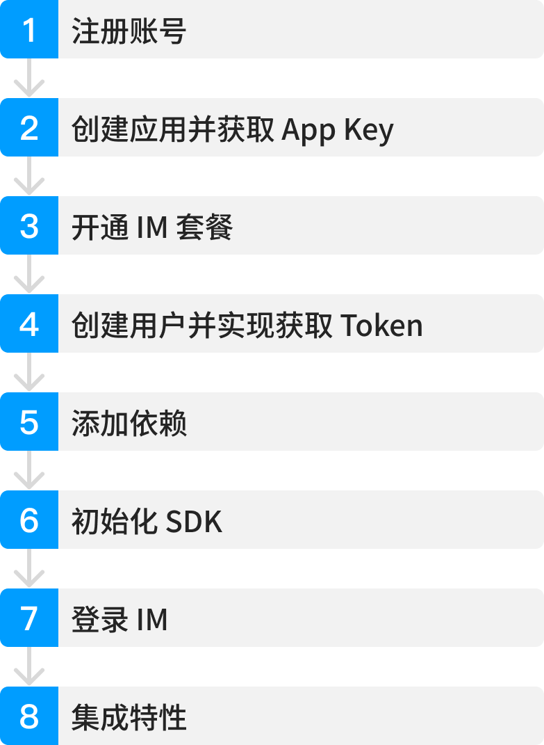 | 创建应用 获取 App Key | 1. 要接入即时通讯 IM 服务,你必须首先在环信控制台 创建应用。 2. 环信会给创建的应用分配 App Key,作为应用的唯一标识。你需要 获取应用的 App Key,集成 SDK 时传入 App Key。 |