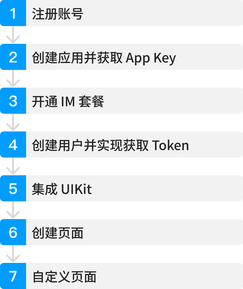 | 集成 UIKit | 将单群聊 UIKit 集成到你的应用: - 安装 UIKit - 添加权限 - 引入头文件 - 初始化 UIKit - 登录 UIKit - 搭建界面 - 打包 app |